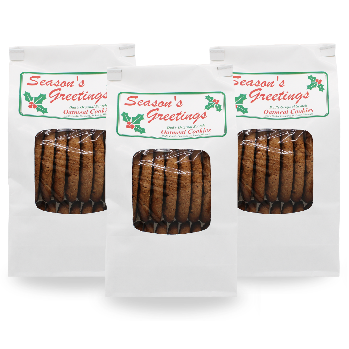 Our famous Original Scotch Oatmeal cookies hand-packed in our Season's Greetings bags. Each bag contains 14oz or roughly 20 of our large cookies. Choose between 3, 12 or 20 bags.